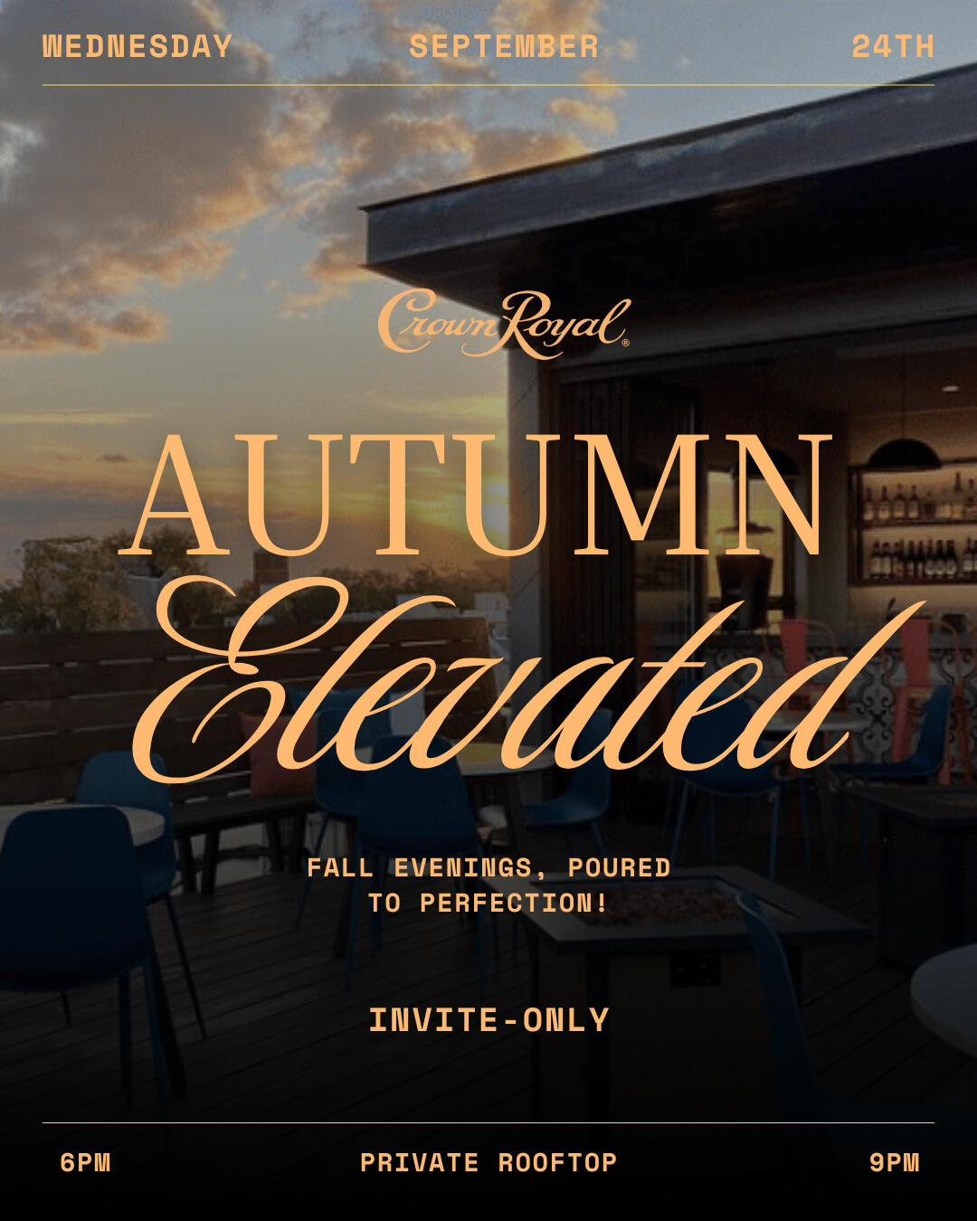 What is Autumn Elevated? It’s a private rooftop escape designed to celebrate fall in its purest form golden skies, cooler nights, and spirits poured with intention. It’s the start of something seasonal, intimate, and unforgettable.Join us on September 24th for an invite-only experience with a complimentary Crown Royal tasting. The rooftop stays private until you’re confirmed.